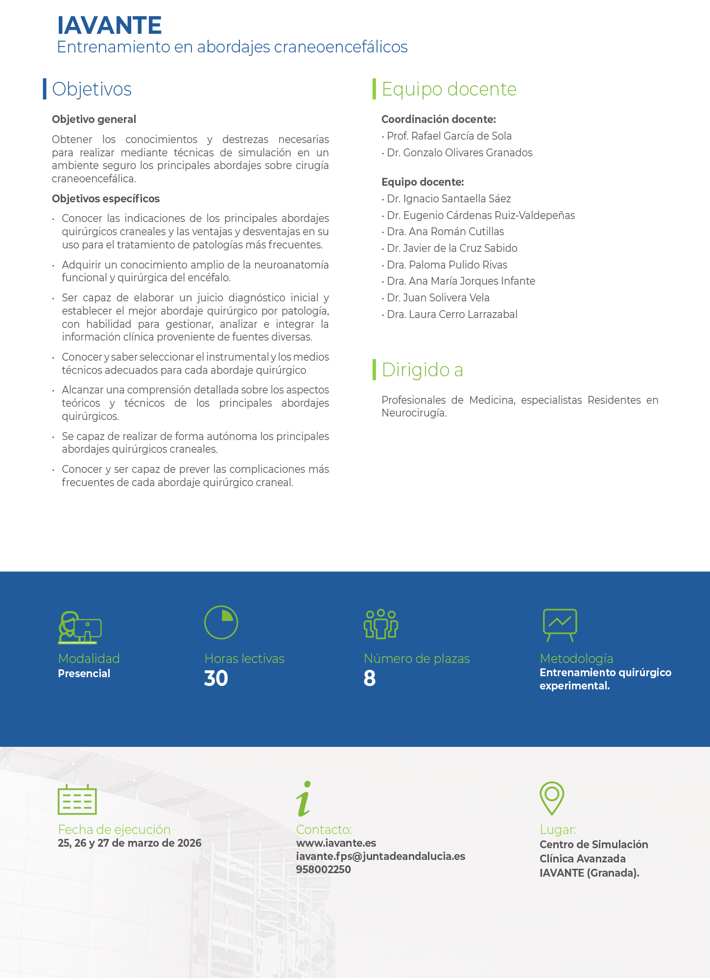 - Obtener los conocimientos y destrezas necesarias para realizar mediante técnicas de simulación en un ambiente seguro los principales abordajes sobre cirugía craneoencefálica.