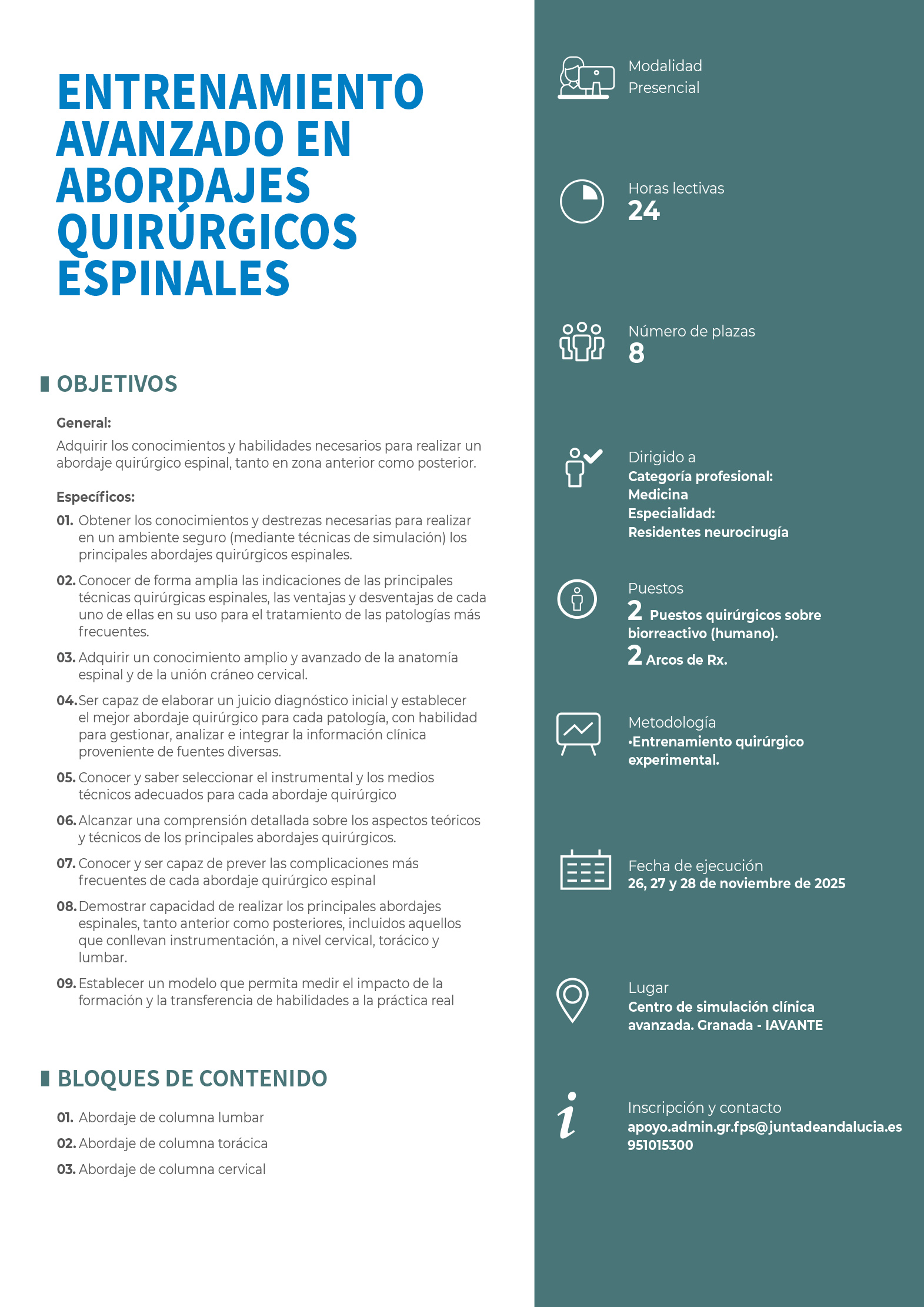 Adquirir los conocimientos y habilidades necesarios para realizar un abordaje quirúrgico espinal, tanto en zona anterior como posterior.